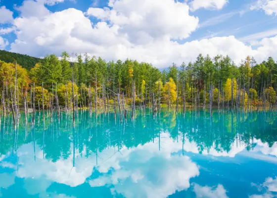 Hồ Blue Pond, nằm ở Biei, Hokkaido nổi tiếng nhờ vào màu xanh ngọc bích độc đáo và vẻ đẹp tự nhiên tuyệt vời. Màu xanh của nước hồ là do sự phản chiếu ánh sáng từ các hạt nhôm trong nước, tạo nên một hiện tượng quang học kỳ diệu. Màu nước của hồ thay đổi theo mùa và điều kiện ánh sáng. Vào mùa hè, màu nước xanh ngọc bích rực rỡ nhất, trong  khi vào mùa đông, hồ có thể bị đóng băng, tạo nên một vẻ đẹp khác lạ. Hồ còn nổi bật với những thân cây khô cằn mọc lên từ mặt nước, tạo nên một khung cảnh kỳ ảo và độc đáo.